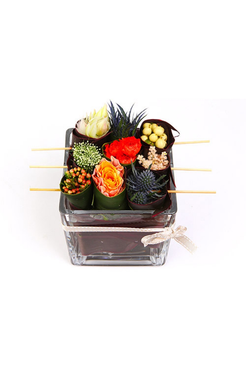 Sushi style flowers in a glass cube