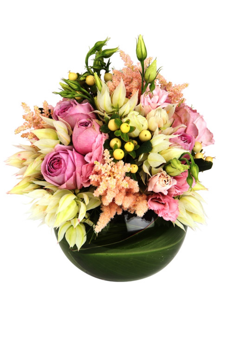 A glass fish bowl filled with mixed seasonal blooms