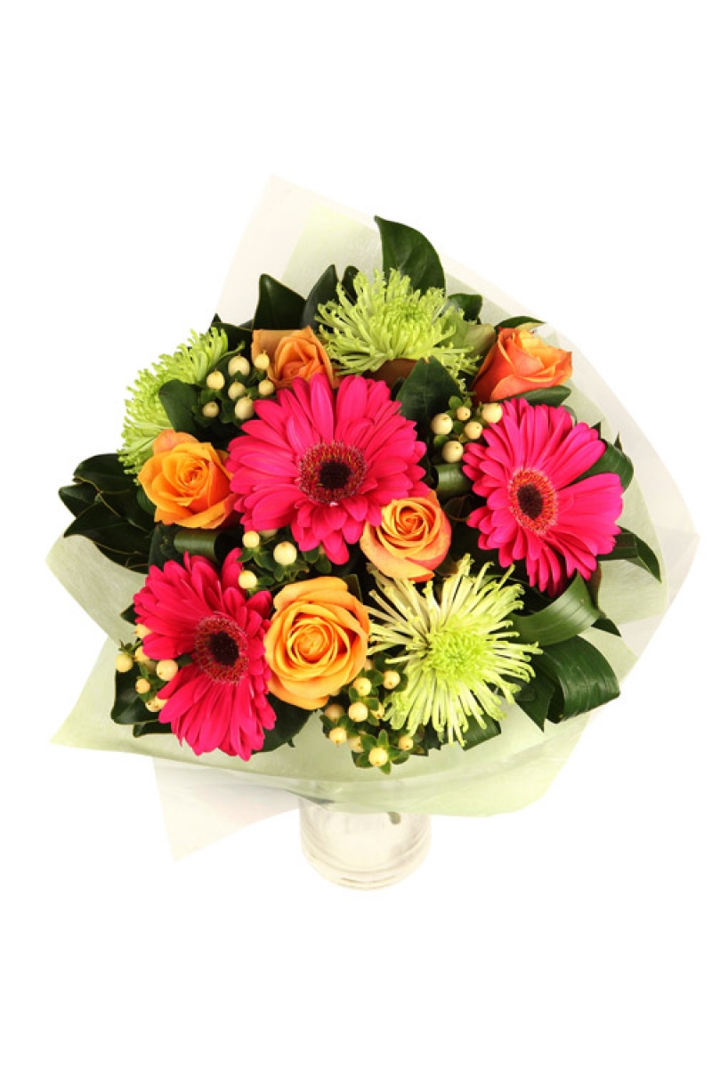 Give that special someone a gift filled with joy and love! This deluxe bouquet of brightly coloured mixed seasonal cottage flowers is sure to bring a smile to anyone who receives it. Elegantly wrapped in green flourishes, it is perfectly suited for birthdays, anniversaries and other special occasions. Vase is included.