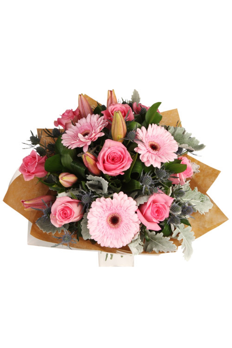 Celebrate that special person in your life with this elegant bouquet of pink coloured lilies, roses and gerberas, accented with green foliage. This will be perfect for birthdays, anniversaries or a special event. Vase is not included.
