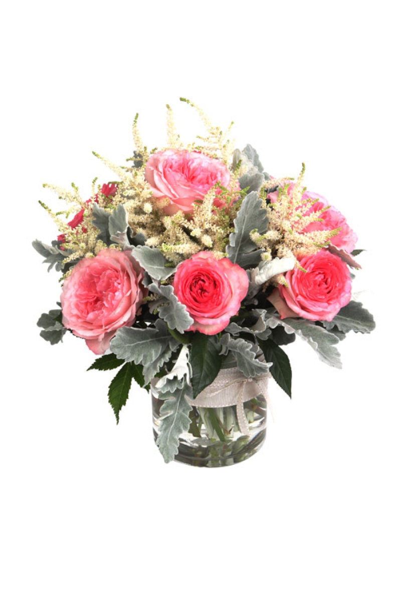 This elegant arrangement of bright pink roses with luscious green leaves is the perfect gift for that special someone. Beautifully presented in a glass vase with a bow accent, it's perfect for a gift of any occasion