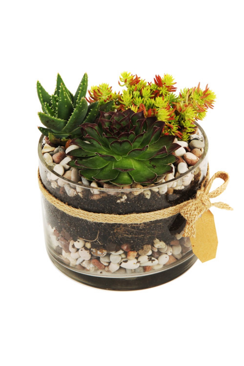 A trio of succulents in a glass vase