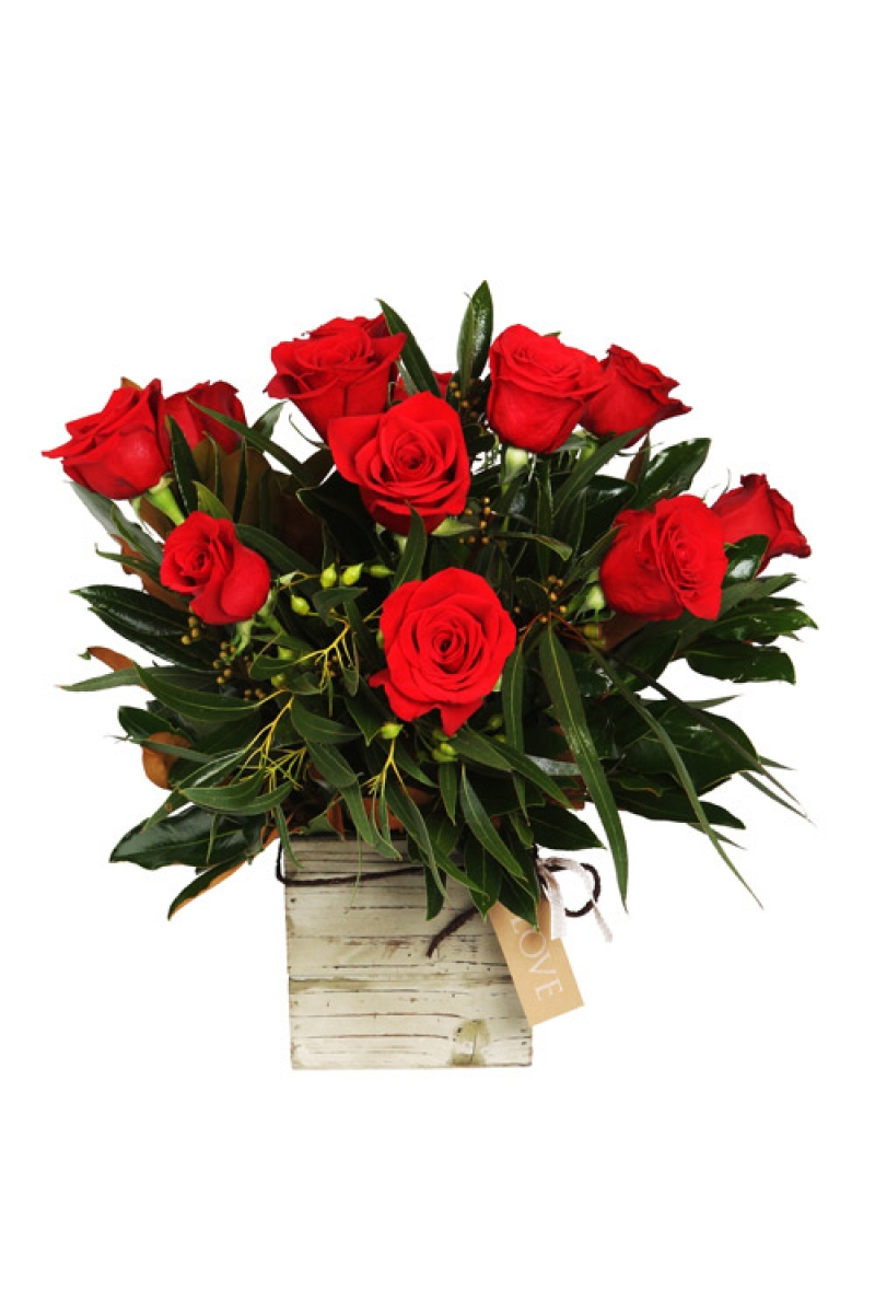 This display of 12 long stemmed roses arranged in a wooden crate is surely to express your true love when words just won't be enough.
