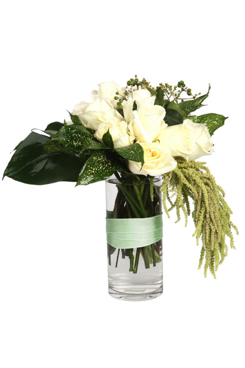 This posy of white roses in a glass vase delivers that message of special importance to your loved ones.